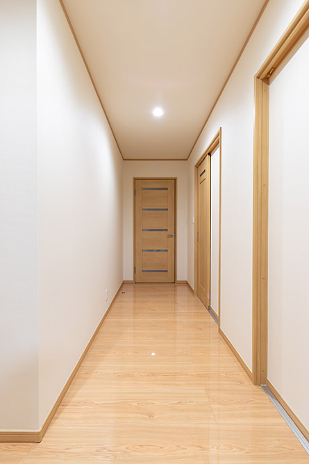 平屋の邸宅を施工いたしました。バリアフリー、広々とした動線の廊下など、住みやすさと快適性を追求した住宅です。また、施主様のご要望で建て替え前のご自宅で使用していた和室の部材を使用し、新しい和室に使用させていただきました(インテリアの26枚目の和室写真です)。